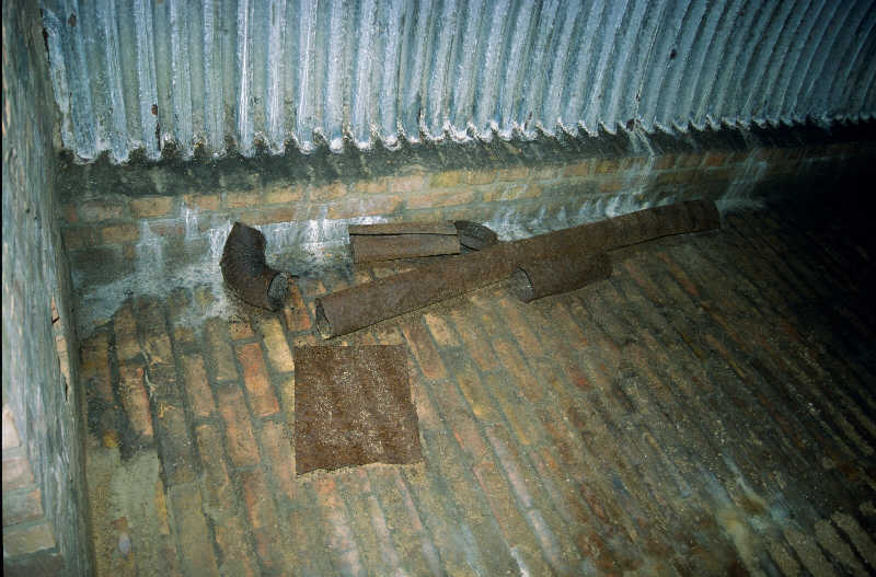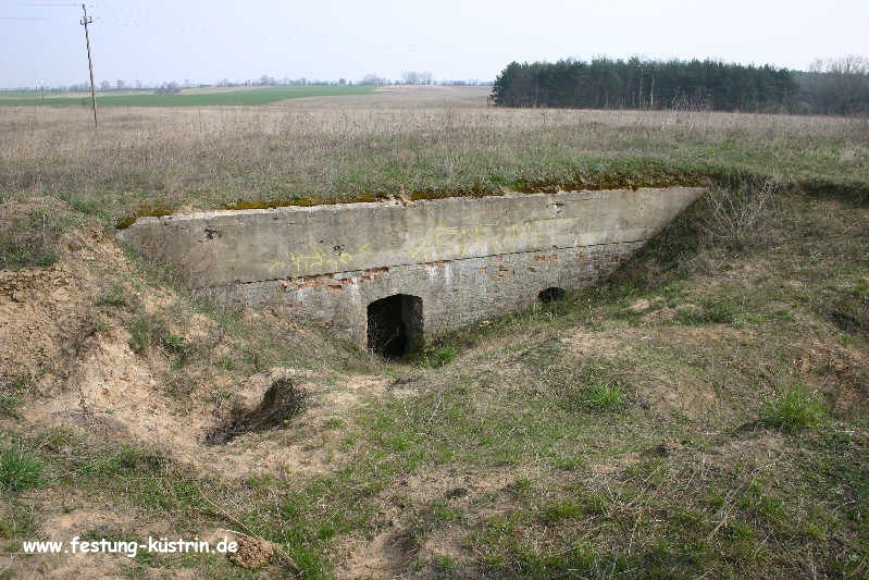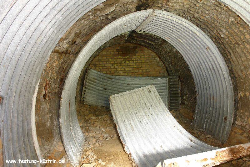 Inzwischen ist auch dieser Bau Opfer von sinnlosen Vandalismus und Müllentsorgung geworden. Schrottdiebe hatten versucht die Blechverschalung abzubauen, scheiterten jedoch an den zu engen Türecken. So blieben die Blechelemente einfach liegen. Resigniert mußten die Mitglieder des Küstriner Geschichtsvereins feststellen, daß es offensichlich ein Fehler war, diesen Infanterieunterstand auszugraben und der Öffentlichkeit zugänglich zu machen. Weitere Ausgrabungen werden daher nicht erfolgen. 2011 wurde der Unterstand vom Grundstückeigentümer übererdet, nachdem auch in weiteren Kasematten die Blechverschalungen abgebaut wurden. |