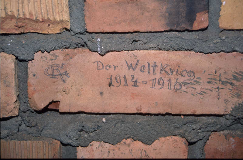 An einer wenig befahrenen Straße zwischen Tamsel (Dabroszyn) und Wilkersdorf (Kresnicska) liegt das Mühlenfünftel (Mlyniska). Die Siedlung besteht aus wenigen Gehöften, weiten Feldern und kleineren Waldstücken. Große Neugier bei Einwohnern und Durchreisenden erweckte am Vormittag des 21.04.1998 eine größere Personengruppe, die etwa 2Meter neben der Straße, mitten auf einem Feldhügel, Erdarbeiten vornahm. zuerst mit dem Spaten und später mit einem Bagger wurde ein großes Betonwerk ausgegraben. Bei der polnischen Bevölkerung wurde das Bauwerk als Hauptquartier von Friedrich den Großen während der Schöacht bei Zorndorf oder auch als letzer Unterschlupf von Hitler gehandelt. Was war mit dem Bauwerk aber wirklich und warum wurde es jetzt ausgegraben? Etwa um 1900 fiel dem Militar auf, daß die Räume zwischen den Forts relativ ungeschützt waren. Sogenannte Zwischenfeldbauten wurden geplant und etwa 1913 - 1915 als Beton und Ziegelbauwerke ausgeführt. Es gab sie in verschiedenen Bauformen und Größen. Als Infanterieunterstände konnten die größten eine preussische Infanteriekompanie mit 150 Mann beherbergen und vor feindlichen Beschuß schützen. Die Interalliierte Militärmission unter französicher Führung hatte nach 1918 die Aufgabe, die Abrüstung Deutschlands zu kontrollieren. Zur Abrüstung gehört auch, daß miltärische Bauwerke unbrauchbar gemacht wurden. Die Bunker gehörten wohl dazu. Sie wurden nicht abgerissen, sondern übererdet. Die meisten der um Küstrin gelegenen waren in französichen Plänen verzeichnet. Einige aber nicht. Man kann nur vermuten, daß sie vor dem ehemaligen Feind versteckt wurden. Archivunterlagen fehlen völlig. Die Aktion am 21.04.1998 fand bei herrlichem Wetter statt. Vor immer mehr Zuschauern wurde ein teil der Rückwand freigelegt. Die Fenster- und Türöffnungen waren so vermauert und abgeputzt, daß irrtümlich zuerst ein Fenster mit Hammer und Meißel geöffnet wurde. Heiner Schenk aus Alttucheband durfte dafür als Erster hineinkriechen. Nach 80 jahren betraten wieder Menschen den Innenraum. Es war ein eigenartigen Gefühl. Wie sah es nun innen aus? Wie erwartet, waren die Gewölbe noch mit verzinkten Wellblech ausgekleidet. Alles war leer mit Ausnahme einiger Kleinigkeiten. Und diese waren das Schönste. Eine Bemerkung des Autors zu einem Reisigbesen, der die 80 Jahre wohl wegen des Sauerstoffmangels überstanden hatte, nutzte ein anwesender polnischer Reporter als Aufmacher seines Artikels am folgenden Tag: "Typisch deutsche Ordnung: Bevor sie den Bunker zumauerten, mußten sie noch fegen". In einer Ecke lagen Überreste einer Zeitung vom März 1918. Jemand hatte sie als Toilettenpapier benutzt. Eine kleine Holsbank diente wohl den Wachsoldaten. So ausgeruht verzierten sie die Ziegelwände mit "Graffitis". Viel war schon unleserlich, aber einiges noch deutlich zu erkennen. Unter anderen "letzte Wache", Weihnachten 1915" und die Namen Friedrich, Rudolf Müller, Bobozynski. Über letzteren freuten sich besonders die polnischen Journalisten. | |