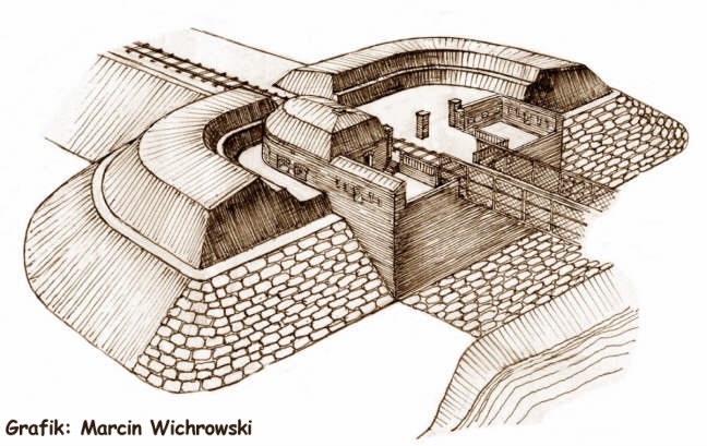 Besatzung von der Schanze vertrieben werden sollte. Es wurde jedoch nur die Gestaltung der Schanze hinter dem Oder-Vorflutkanal an die bestehenden morastigen Niederungen angepasst, während die Warthe-Kaponiere integraler Bestandteil vom Brückenende wurde. Die Ende der 70er Jahre des 19.Jh. an der neu gebauten Eisenbahnlinie errichteten Sicherungen waren schon an die neuen Anforderungen angepasst. Die freistehenden Mauern fehlten hier, mit Ausnahme von denen mit den Scharten versehenen, waren alle Wände der Blockhäuser von dicken Erdaufschüttungen bedeck, welche sie vor den | |