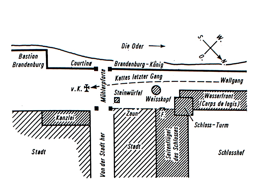 Um sich der Erziehungsgewalt seines Vaters zu entziehen, versuchte Friedrich am 5. August 1730 aus seinem Reisequartier in Steinsfurt nach England zu fliehen. Die Flucht scheiterte. Katte, durch einen kompromitierenden Brief als Mitwisser überführt, wurde verhaftet und zu lebenslanger Festungshaft verurteilt. Doch wütend kritisiert König Friedrich-Wilhelm das Urteil. Als der zweite Richterspruch unverändert ausfällt, ändert der König das Urteil in die Todesstrafe für Katte um und akzeptiert die Nichtzuständigkeit des Gerichts zu Friedrich, wohl auch aus politischen Gründen, da sich bereits Kaiser Karl VI. als auch Prinz Eugen für den Prinzen verwandt hatten. Katte und Friedrich werden am 4. Spetember 1730 in die Festung Küstrin gebracht. Friedrich erhält im Küstriner Schloß zwei Zimmer im ersten Stock, die sehr spärlich eingerichten sind, Katte wird in die Arrestzelle im Zorndorfer Tor eingesperrt. Da der König einen weiteren Fluchtversuch fürchtete, wurden nicht nur die Wachen im Schloß verstärkt, sondern auch der Fremdenverkehr in der Stadt stärker kontrolliert. Die wachhabenen Offiziere wurden mit der Versorgung des Prinzen betraut, jegliche Unterhaltung mit dem Gefangenen war verboten. Es fand sich jedoch Gelegenheiten, die strenge Verwahrung zu umgehen. Der französisch sprechende achtjährige Sohn des Kammerpräsidenten von Münchnow wurde von den Wachen zum Prinzen gelassen und schmuggelte kleine Dinge zum Prinzen, die ihm das Leben als Gefangener erträglicher machten. Später als König sollte sich Friedrich für diese Gefälligkeiten noch erkenntlich zeigen. Am 6.November 1730 wurde Friedrich durch den Festungskommandanten mitgeteilt, daß er der in wenigen Stunden erfolgenden Hinrichtung Kattes auf Befehl des Königs von seinem Fenster aus zu zusehen habe. | |