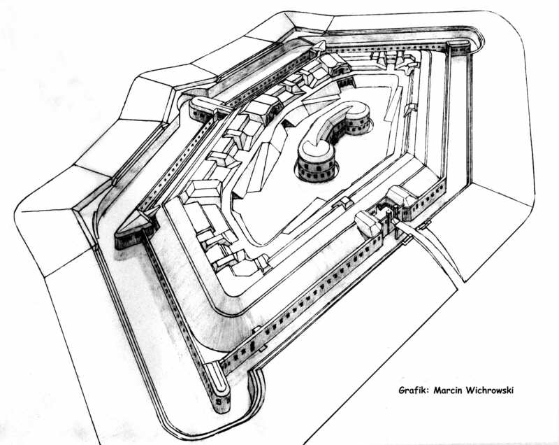 Das Fort umgibt ein etwa 10m breiter trockener Graben, der von einer Kontereskarpenmauer gestützt wird. Zur Verstärkung der etwa 1m dicken Mauer wurden im regelmäßigen Abständen Stützpfeiler aufgemauert. Ostwärts, in Richtung der Hauptangriffseite, wurden Minengänge vorbereitet. Die Grabeninnenseite wurde durch eine weitere Mauer mit Gewehrscharten geschützt. Den Graben deckten an den Eckpunkten Kaponieren, in denen der Feind im Graben durch Gewehr- und Kartätschenfeuer bekämpft werden konnte. Die Kaponiere waren durch Traversen mit dem Forthof verbunden. Das Werkinnere war durch eine Zugbrücke erreichbar. Auf dem Oberwall befanden sich die Geschütze, die durch Traversen gegen Geschoßsplitter geschützt waren. Die Munitionsmagazine waren zur besseren Deckung in den Oberwall eingelassen. Die benötige Munition wurde durch handbetriebene Aufzüge zu den Munitions- ausgaben transportiert. |