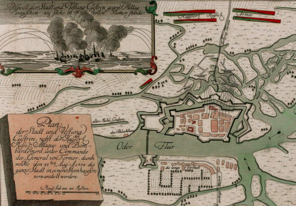 Im Zuge der militärischen Auseinandersetzungen im Siebenjährigen Krieg drangt die russische Armee, von Ostpreußen kommend, auf Brandenburg vor. Daraufhin wurde die Küstriner Garnison auf 2000 Mann verstärkt. Am 14. August 1758 besetzten preussische Truppen den Weinberg in der Nähe der kurzen Vorstadt, mußten sich aber gegen stärkere russische Verbände zurückziehen. Die russischen Verbänden errichteten dort und später in der Vorstand, völlig unbehelligt von der Festungsbesatzung, Belagerungsbatterien um am 15.August Stadt zu beschießen. Die Festungsbesatzung antworte ihrerseits mit einer lebhaften Kanonade. Doch eines der ersten feindlichen Geschosse traf das Strohlager in der Hintergasse. Es entstand ein Brand, der nach kurzer Zeit auf die meist aus Fachwerk erbauten Häuser übergriff und die gesamte Stadt einäscherte. Lediglich drei Gebäude blieben erhalten. | |