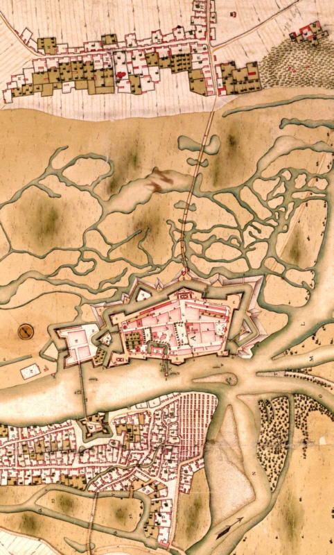 Küstrin um 1740. Die Festungswerke verhindern die Ausdehnung der Stadt. Die lange Vorstadt ist inzwischen größer als die Festungsstadt selbst. |