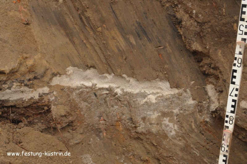 Bodenprofil in der Berliner Straße: Holzbohlen als Fußgängerweg, darüber die Schwemmsandschicht der Überschwemmung von 1736. 20cm darüber die Brandschicht von 1758 |