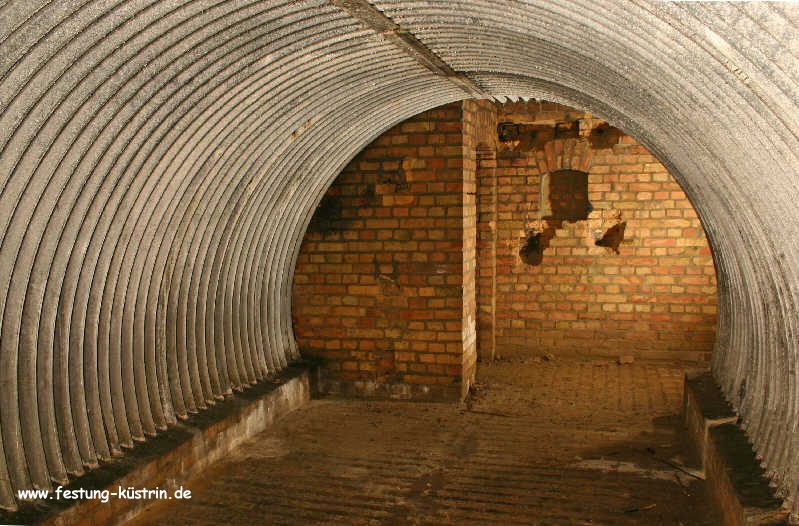 Inzwischen ist auch dieser Bau Opfer von sinnlosen Vandalismus und Müllentsorgung geworden. Schrottdiebe hatten versucht die Blechverschalung abzubauen, scheiterten jedoch an den zu engen Türecken. So blieben die Blechelemente einfach liegen. Resigniert mußten die Mitglieder des Küstriner Geschichtsvereins feststellen, daß es offensichlich ein Fehler war, diesen Infanterieunterstand auszugraben und der Öffentlichkeit zugänglich zu machen. Weitere Ausgrabungen werden daher nicht erfolgen. 2011 wurde der Unterstand vom Grundstückeigentümer übererdet, nachdem auch in weiteren Kasematten die Blechverschalungen abgebaut wurden. |
