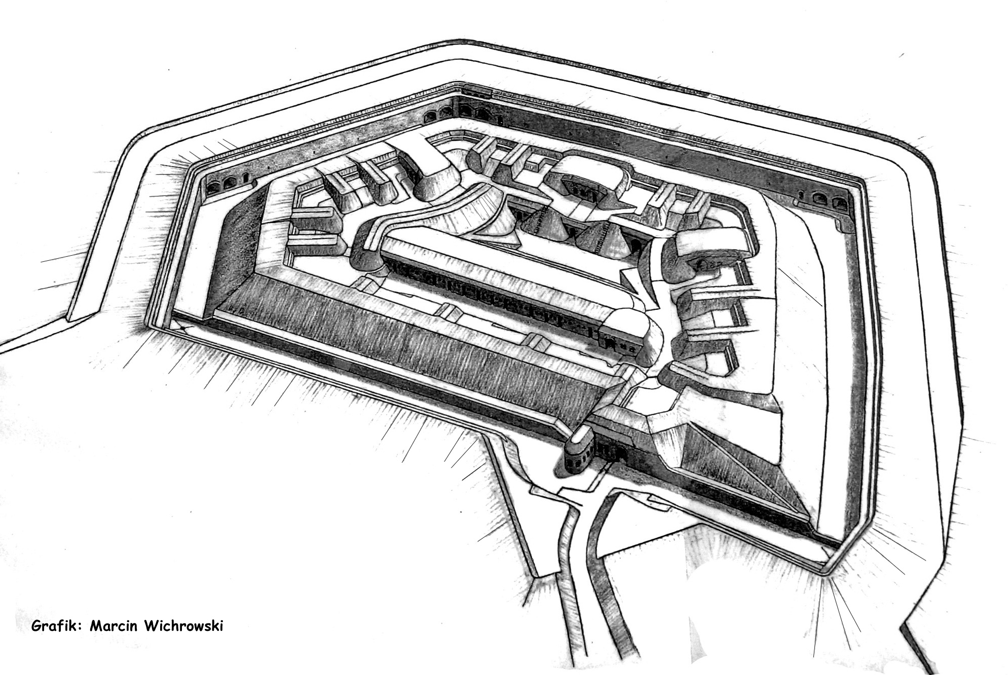 Als das Fort 1888-1890 erbaut wurde, war das Ingenieurkorps der Armee nicht mehr an die strengen Richtlinien des General Biehler gebunden. So konnten die neuesten Erkenntnisse beim Bau des Forts berücksichtigt werden. Das Fort wurde daher als geschlossene fünfseitige Redoute erbaut. Ähnlich wie im Fort Säpzig wurden auch im Fort Tschernow die Bauarbeiten auf das notwendigste reduziert. Die schußsichere Kehlkaserne errichtete man erst 1914 im Zuge der Armierungsarbeiten. Das Fort wurde für eine Kompanie Infanterie und Artillerie konzipiert. Der Kampfraum der Infanterie war der gedeckte Weg und der Wall des Forts, während die Artillerie auf den Geschützbänken im Fortinnereren Stellung bezog. Über die Nutzung des Forts bis 1945 ist nichts bekannt. Nach dem Krieg wurde das Fort militärisch nicht verwendet und der örtliche Bürgermeister ließ das Fort bis in die 50er Jahre hinein zur Baustoffgewinnung abreißen. Die äußeren Bauten sind zum großen Teil vernichtet. Lediglich die Hauptpoterne mit dem Pulvermagazin und der darüberliegenden Munitionstraverse sind erhalten. | |